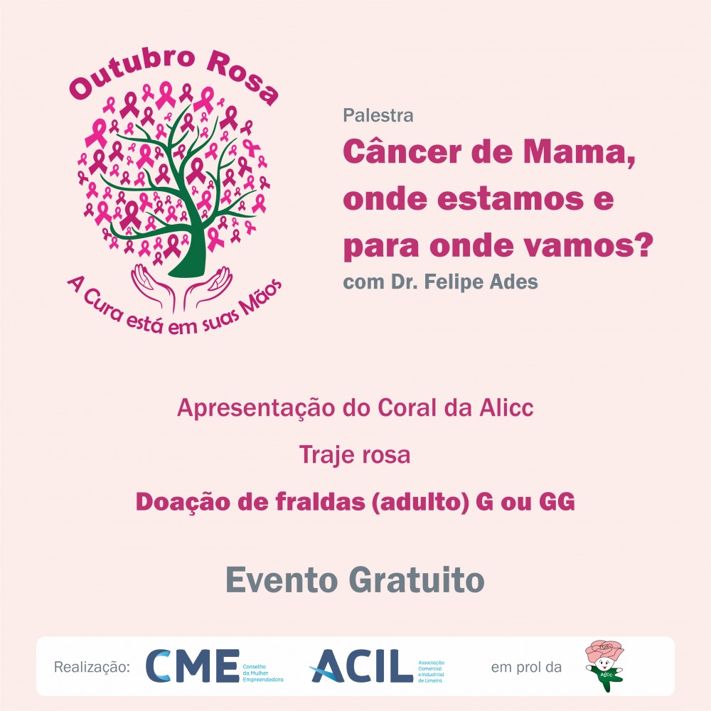 O Conselho da Mulher Empreendedora da ACIL, em parceria com a Associação Limeirense de Cuidado e Carinho – ALICC, realizará mais uma edição do evento “Outubro Rosa”, que este ano contará com uma palestra especial com o respeitado médico oncologista, Dr. Felipe Ades. Em seguida os participantes terão uma apresentação especial do Coral da ALICC e para finalizar apreciarão um delicioso coquetel.