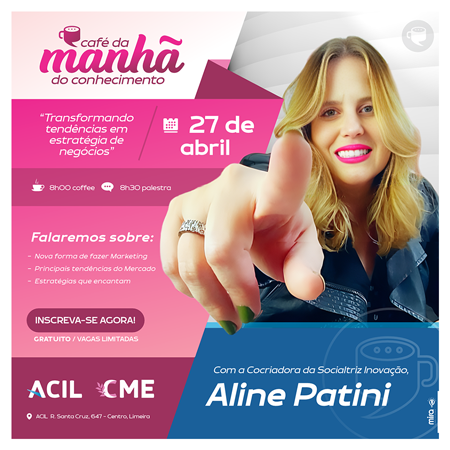 O Café da Manhã do Conhecimento, evento realizado pelo Conselho da Mulher Empreendedora (CME) da ACIL que acontecerá no dia 27 de abril, trará Aline Patini, cocriadora da Socialtriz Inovação com a palestra "Faça de propósito: transformando tendências em estratégia de negócios".