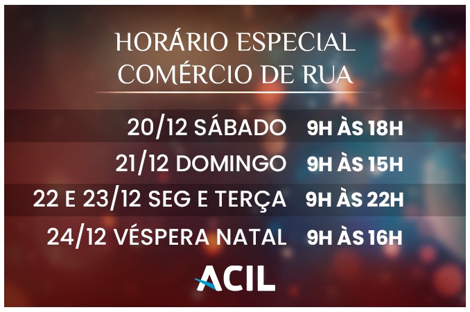 Conforme a programação divulgada pela ACIL, no sábado, dia 20 de dezembro, as lojas estarão abertas das 9h às 18h. No domingo, dia 21, o atendimento ocorre das 9h às 15h, ampliando as opções de compra para a população. Já na segunda-feira, dia 22, e na terça-feira, dia 23, o comércio funcionará em horário estendido, das 9h às 22h. Na quarta-feira, dia 24, véspera de Natal, as lojas atenderão das 9h às 16h.