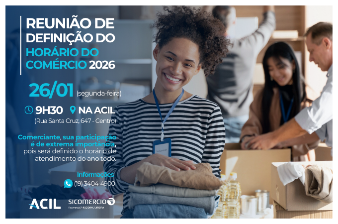 A Associação Comercial e Industrial de Limeira (ACIL), em parceria com o Sicomercio Limeira, realiza no próximo dia 26 de janeiro (segunda-feira) a Reunião de Definição do Horário do Comércio 2026. O encontro será às 9h30, na sede da ACIL, localizada na Rua Santa Cruz, 647, Centro.