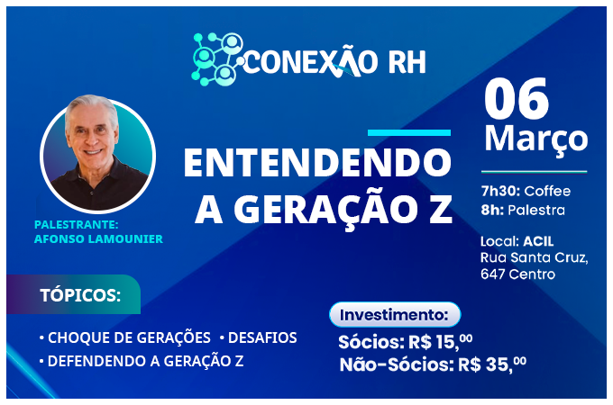 A ACIL realiza no dia 06 de março, às 7h30, mais uma edição do Conexão RH, encontro voltado a profissionais de recursos humanos, gestores e lideranças empresariais. O evento acontece na sede da associação e traz como tema “Entendendo a Geração Z”, assunto cada vez mais estratégico para as organizações.