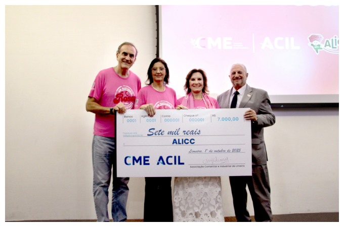 Aproveitando o encontro entre CME e ALICC, foi realizada também a entrega do cheque simbólico no valor de R$ 7.000,00, referente a parte da renda arrecadada na Corrida Florescer, destinada neste ano à ALICC. A entrega foi feita pela superintendente do CME, Maria Regina Calderari, pelo presidente da ACIL, Dr. Valmir Martins, e contou com a presença de todas as conselheiras do Conselho da Mulher Empreendedora, reforçando o compromisso da entidade com causas de grande impacto social.